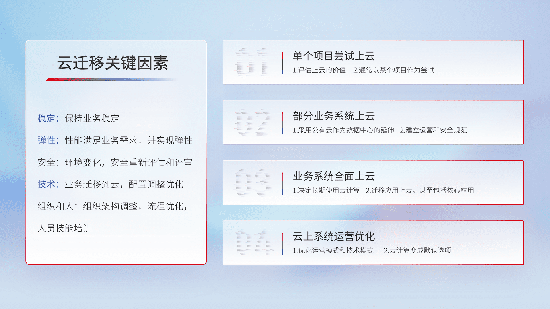 结合实际业务,,,,从规划设计、、云平台选型、、、、云原生改造、、、、数据迁移、、、集成交付,,,,迁移全过程为客户识别最佳上云路径,,做好风险识别管理,,,,设计网络架构、、、、身份权限、、、、安全审计合规、、、操作审计、、、、日志审计、、、监控告警策略、、、多站点容灾设计等,,,对云上基础设施进行整体规划,,,,提升IT治理水平,,,以满足弹性、、、高可用、、、、高性能的需求。。。。