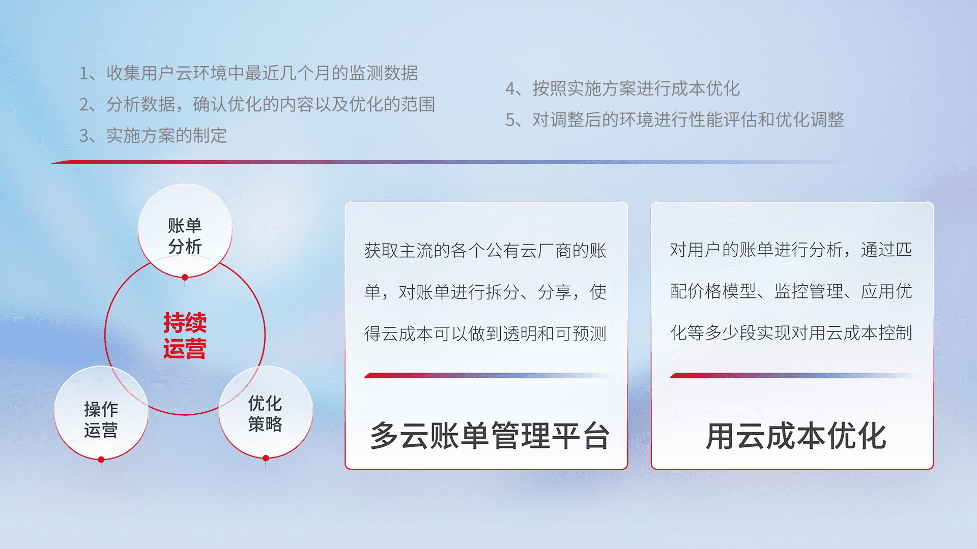 通过多云纳管,,,,以统一的资源数据模型把客户的云资源进行抽象和封装,,,进而实现对多云资源的统一操作,,保障云资源管理的可靠性、、、稳定性与可用性。。量身定制化运维内容,,,配置、、、开发运维、、、、补丁管理、、、、备份、、、监控、、、、认证和访问管理、、、审计和日常巡检等,,,,保障在用云过程中的可靠度,,,,稳定度以及高可用率。。。